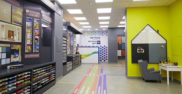 Уютная клиентская зона с возможностью протестировать цвет в различных вариантах освещения даст возможность определиться с продуктом и цветом под ваши задачи.