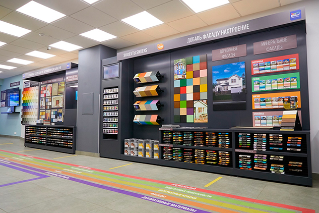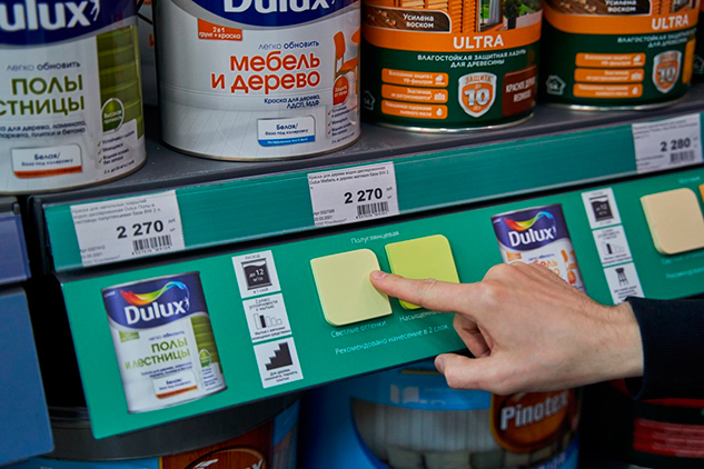 Для удобства и простоты выбора продукции «Мастерская цвета Duluх» оснащена удобной цветовой навигацией на полках. В выкладке продукции использован категорийный подход «от задачи», который позволяет легко найти нужный продукт даже без помощи консультанта.
